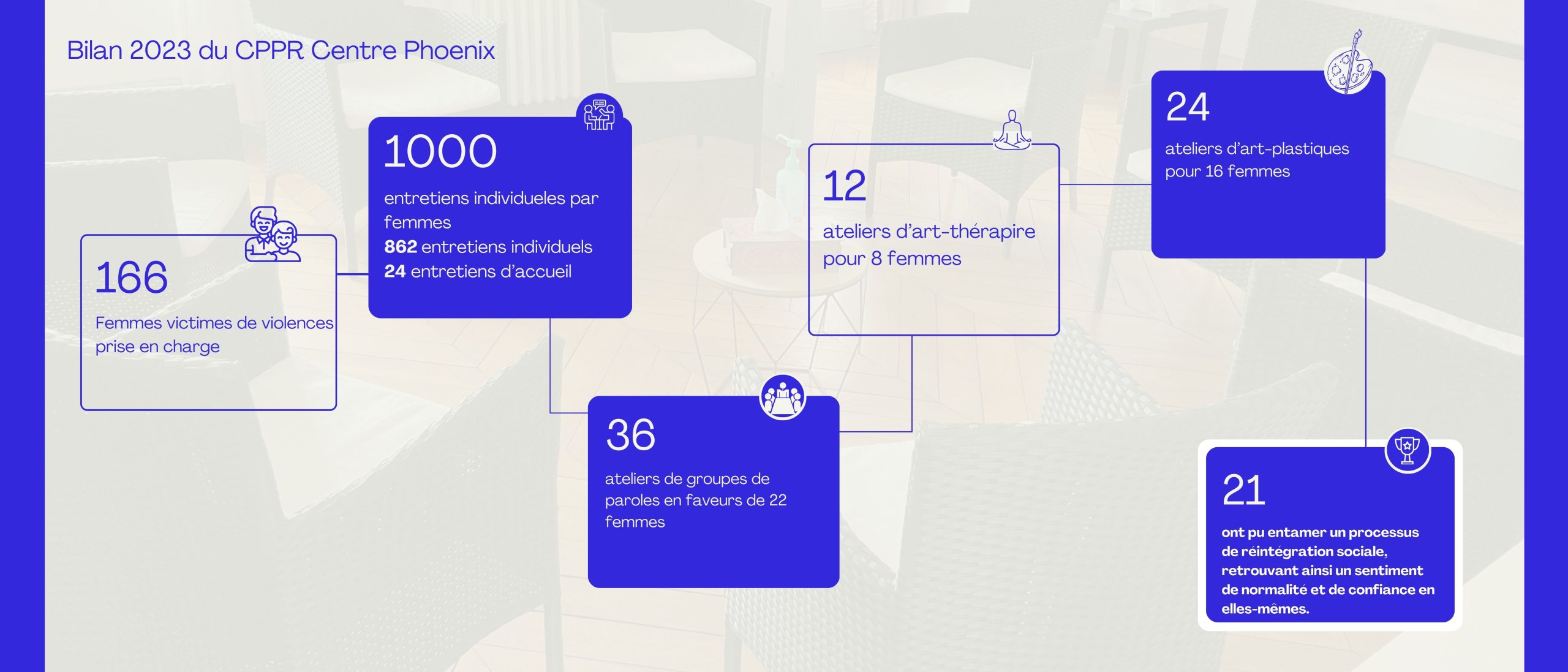 Le suivi psychologique du Centre Phoenix a bénéficié à 24 femmes victimes de violences, témoignant de l’impact direct sur la vie des survivantes.